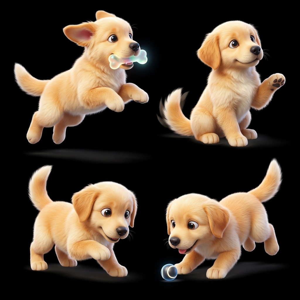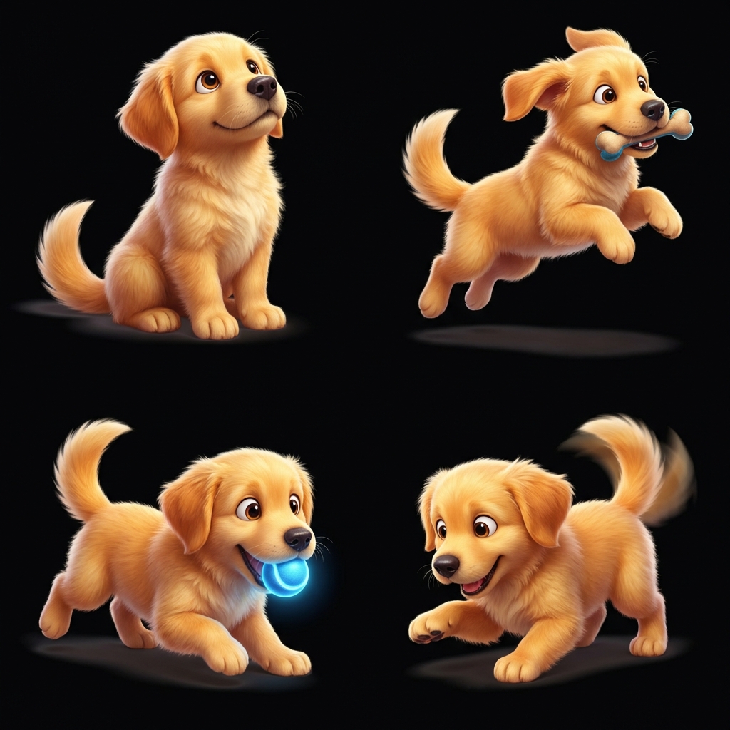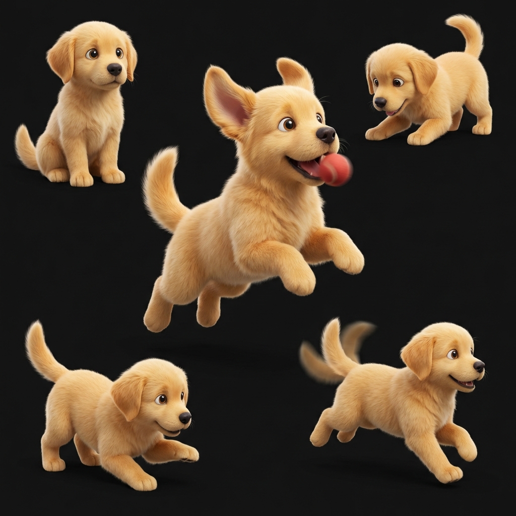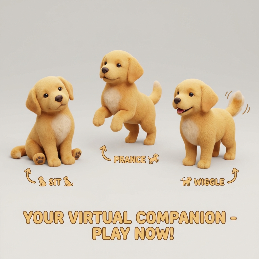 Adorable golden retriever puppy with soft fur, floppy ears, and tail wag animation. Follows owner.