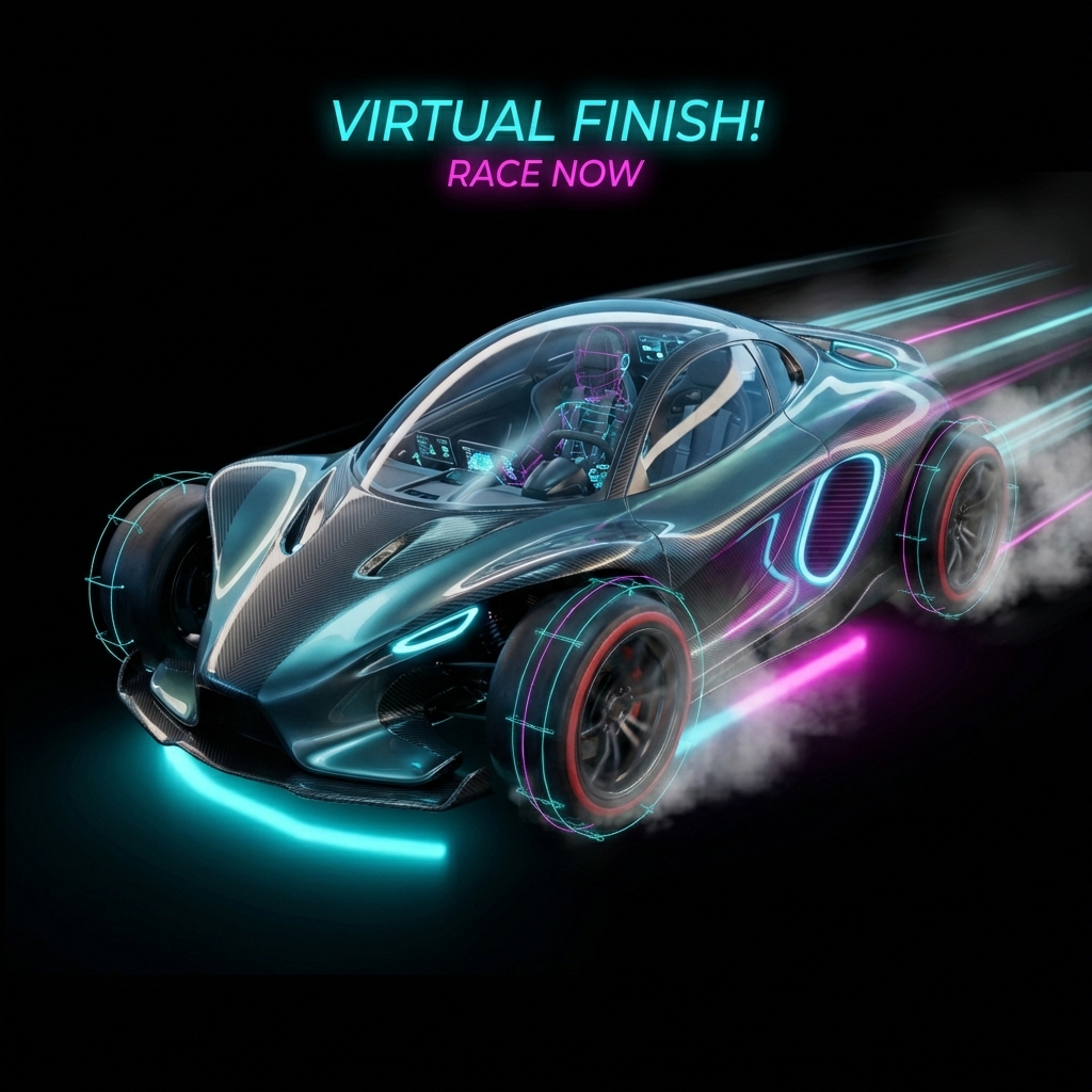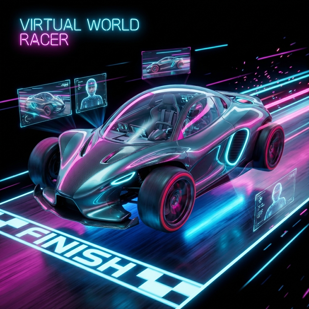 Futuristic racing vehicle with neon underglow, holographic HUD, and anti-gravity hover system.